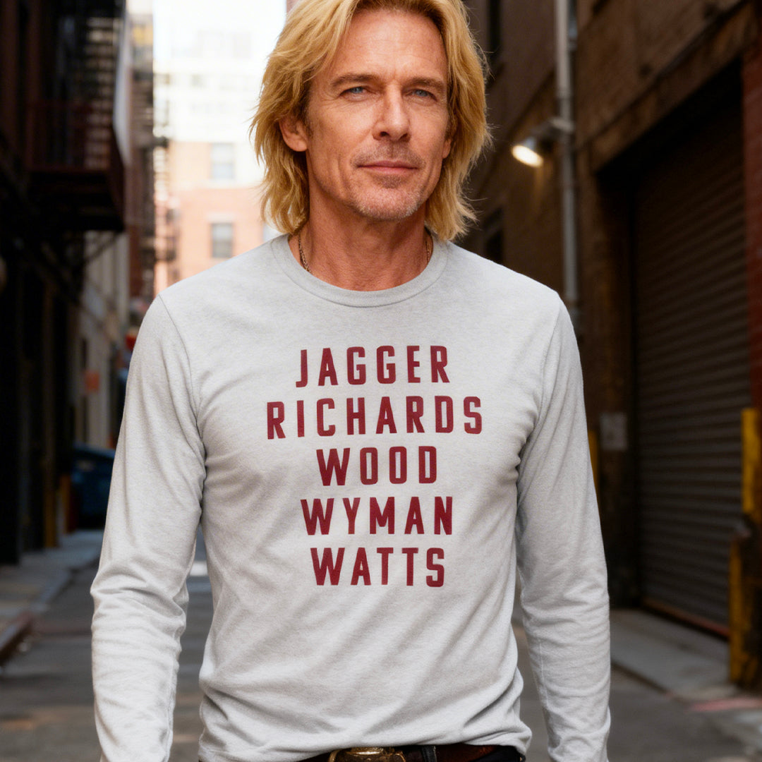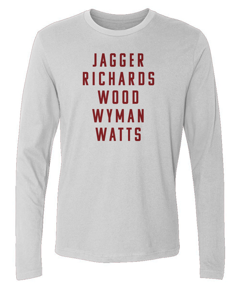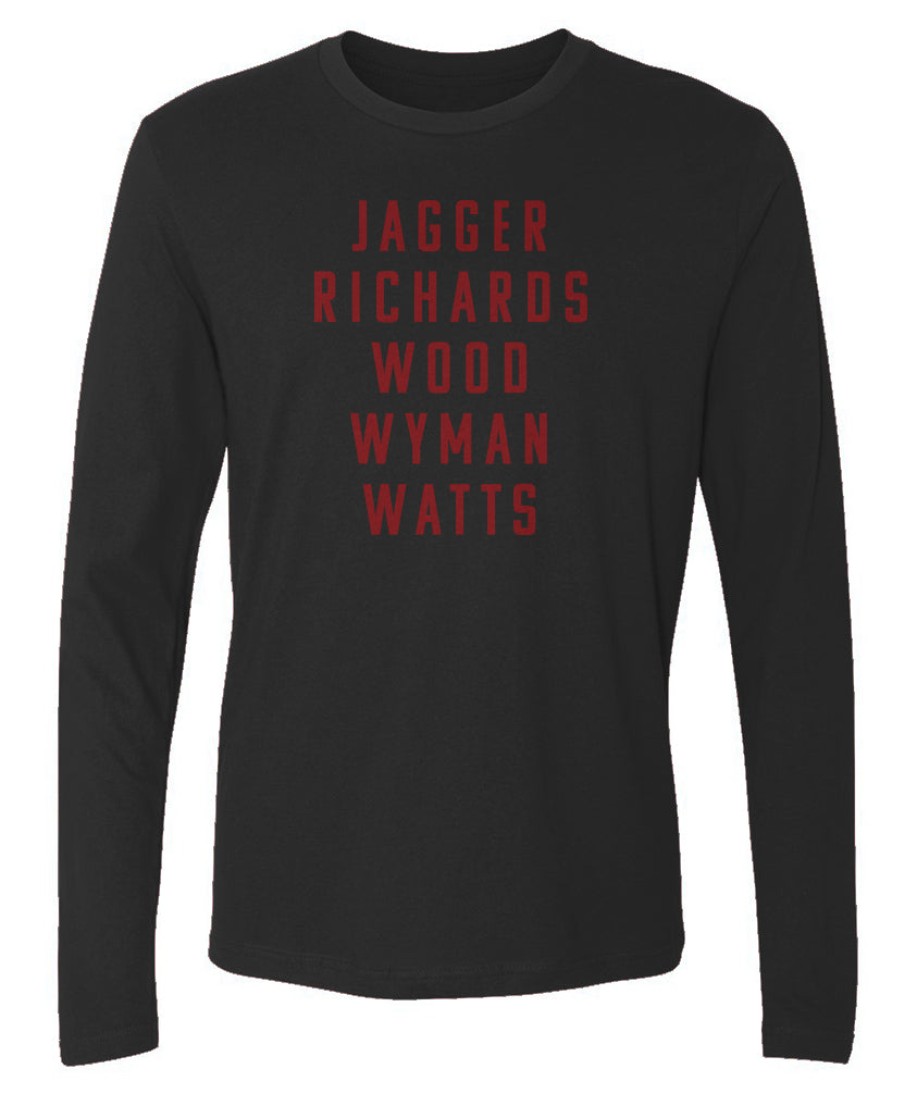Wood brought a different energy than Taylor — looser, more collaborative, a natural foil for Richards. The chemistry was immediate and it lasted. This is the lineup most people picture when they think of the Rolling Stones. This long sleeve honors the five who made that era legendary.
