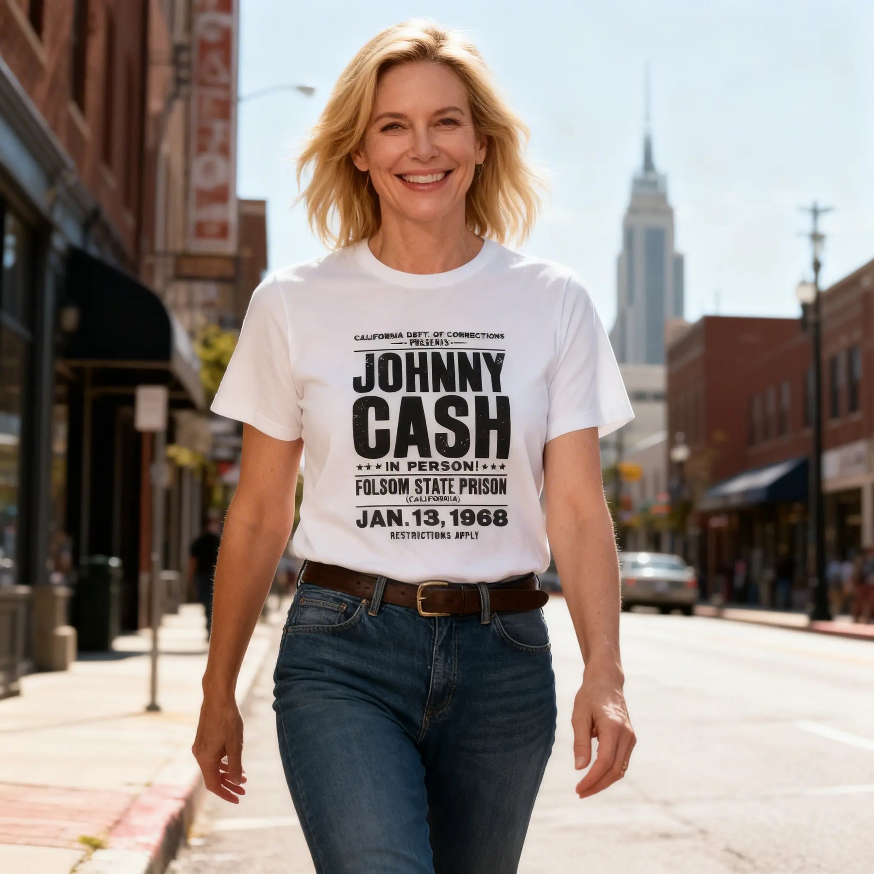 From his early days at Sun Records alongside Elvis Presley to his legendary concerts at Folsom Prison and San Quentin, Johnny Cash lived the stories he sang about. His deep, distinctive voice and honest songwriting about love, loss, redemption, and the struggles of everyday people made him a voice for the voiceless. Whether performing "I Walk the Line," "Ring of Fire," "Folsom Prison Blues," or his powerful cover of "Hurt," Cash brought authenticity and raw emotion to everything he touched. The Man in Black wasn't just a nickname - it was a statement of solidarity with the downtrodden and forgotten. This tee celebrates the legend, the music, and the enduring legacy of Johnny Cash.