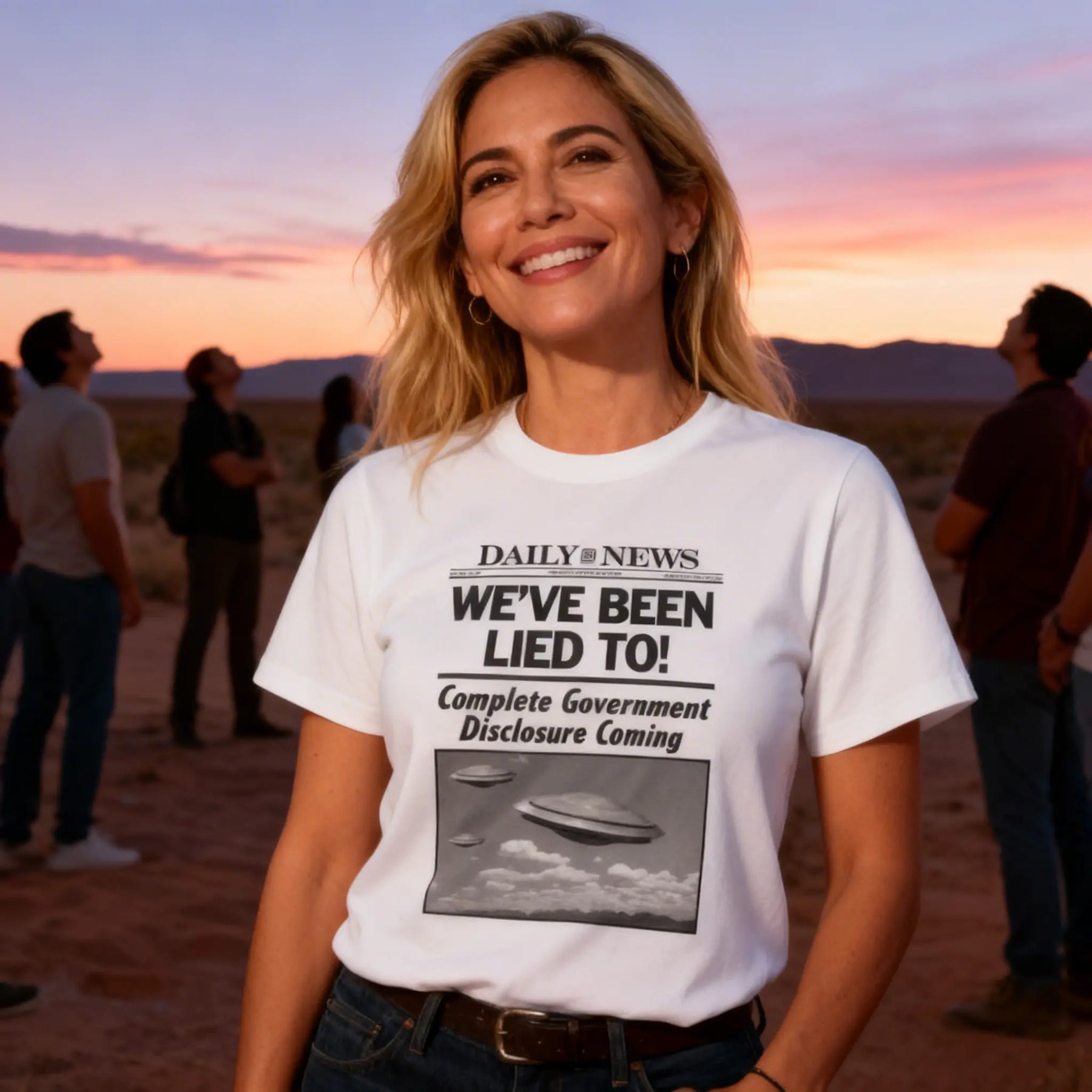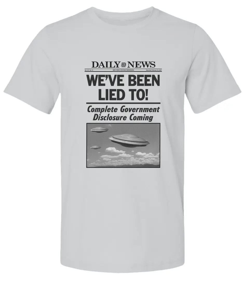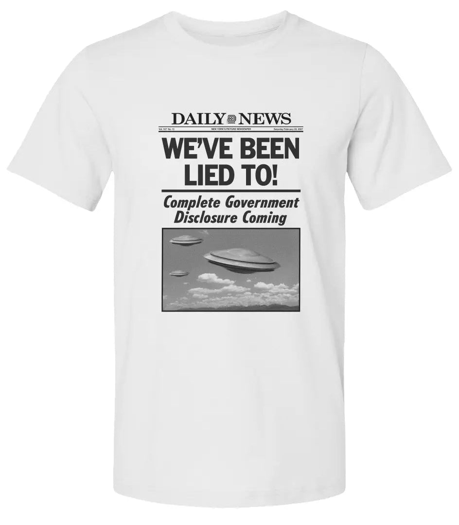 Amp'd Apparel's "We've Been Lied To!" t-shirt captures the zeitgeist of a generation demanding transparency. Designed in a classic newspaper headline format, this bold statement piece features the "Daily News" masthead above the unmistakable declaration that's been on everyone's mind since recent Congressional UFO hearings. The vintage-style flying saucer imagery evokes the golden age of UFO sightings while the subheading "Complete Government Disclosure Coming" speaks to our current moment of revelation. Printed on comfortable, high-quality fabric, this shirt isn't just apparel—it's a conversation starter, a truth-seeker's badge, and a nod to everyone who's been saying "I told you so" for decades. Whether you're a longtime believer, a curious skeptic, or someone who just appreciates the cultural phenomenon of UFO disclosure, this shirt lets you wear your curiosity (and vindication) on your sleeve. Perfect for anyone ready to acknowledge that the truth really is out there, and it's finally coming to light.